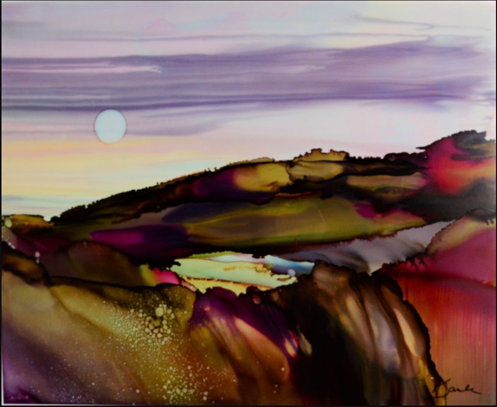 Biography: I’ve been self-employed for most of my working career and have oil painted for about 45 of them. When Covid made its entrance, I closed my Townsend bed and breakfast for a couple of months and decided to try something new. In fifty-eight days I wove twenty-four baskets and finished seven oil paintings. Then I decided to give my shoulder a rest from both weaving and wielding a long brush and started creating alcohol ink paintings. When my B&B opened back up and I quickly sold the artwork I had created, I sold the B&B and started a new full time career! What I love about alcohol inks is the vibrancy of the color and the utter spontaneity. For the most part I rarely use a brush. Along with selling my artwork on my website, I have fourteen shows scheduled this year and am currently building an art gallery, Gracehill Fine Art and Basketry, in Townsend, TN.